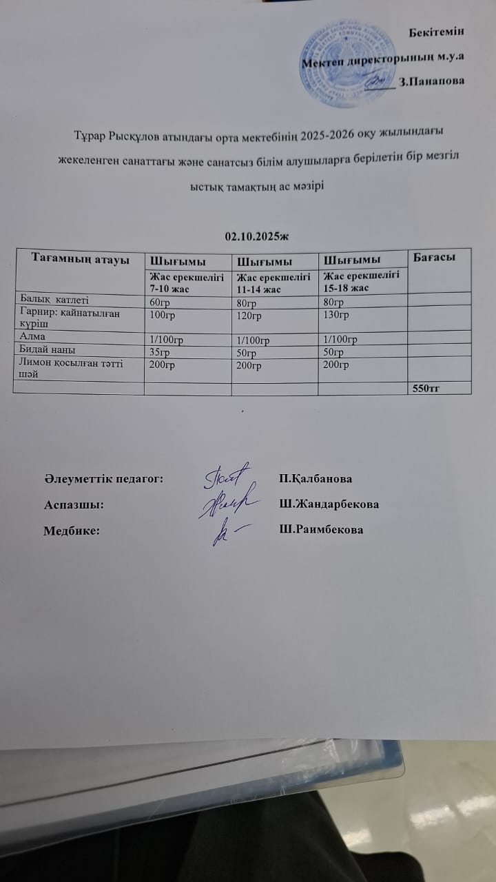 Тұрар Рысқұлов атындағы орта мектебінің 2025-2026 оқу жылындағы 02.10.2025ж. күнгі Жекеленген санаттағы және санатсыз білім алушыларға тегін берілетін бір мезгілдік Ыстық тамақтың ас мәзірі » Сш Т.Рыскулова